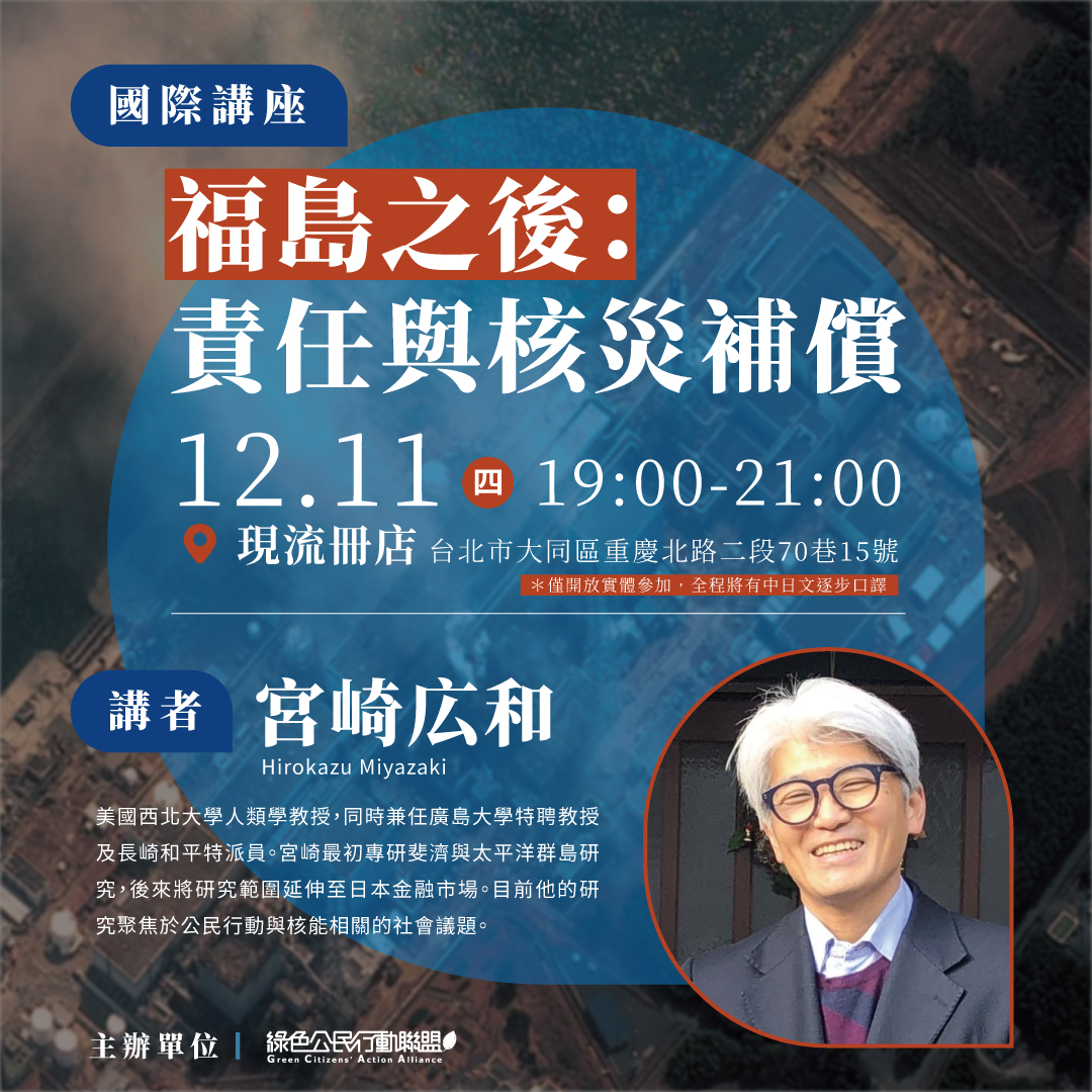 綠色公民行動聯盟特別邀請到美國西北大學人類學系教授宮崎広和(Hirokazu Miyazaki)舉辦演講,從人類學家觀點,聚焦福島核災後的現況與賠償制度。
